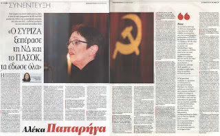 Είδα με ιδιαίτερη χαρά την συνέντευξη της Αλέκας Παπαρήγα στα ΝΕΑ του Σαββατοκύριακου. Το τελευταίο διάστημα την είχα χάσει. Δεν έκανε δημόσιες εμφανίσεις. Χαίρομαι που είναι καλά καθώς ουδέποτε προσωποποίησα τις πολιτικές και ιδεολογικέ διαφορές. Όχι μόνο με την Αλέκα αλλά με τον οποιοδήποτε.